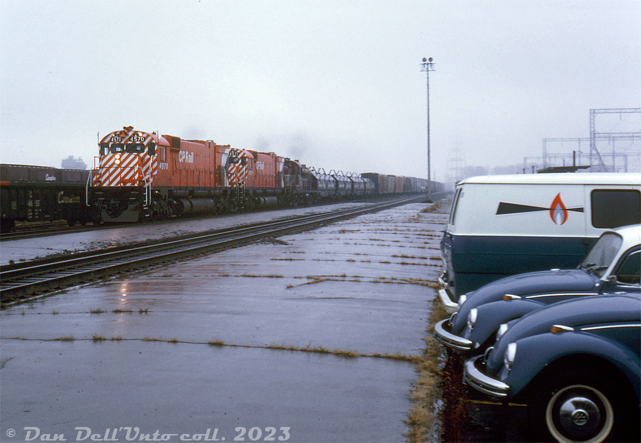 Caption: The action red paint on brand new CP Rail M630 units 4570 and 4571 cuts through the gloom as they pass by the platforms of Leaside Station on a westbound extra freight (white class lights and flags present) with an 8400-series RS3 trailing. Not sure what was up with the matching VW bugs, perhaps some railfans out for new power, or maybe they belonged to a local company that used the parking lot.