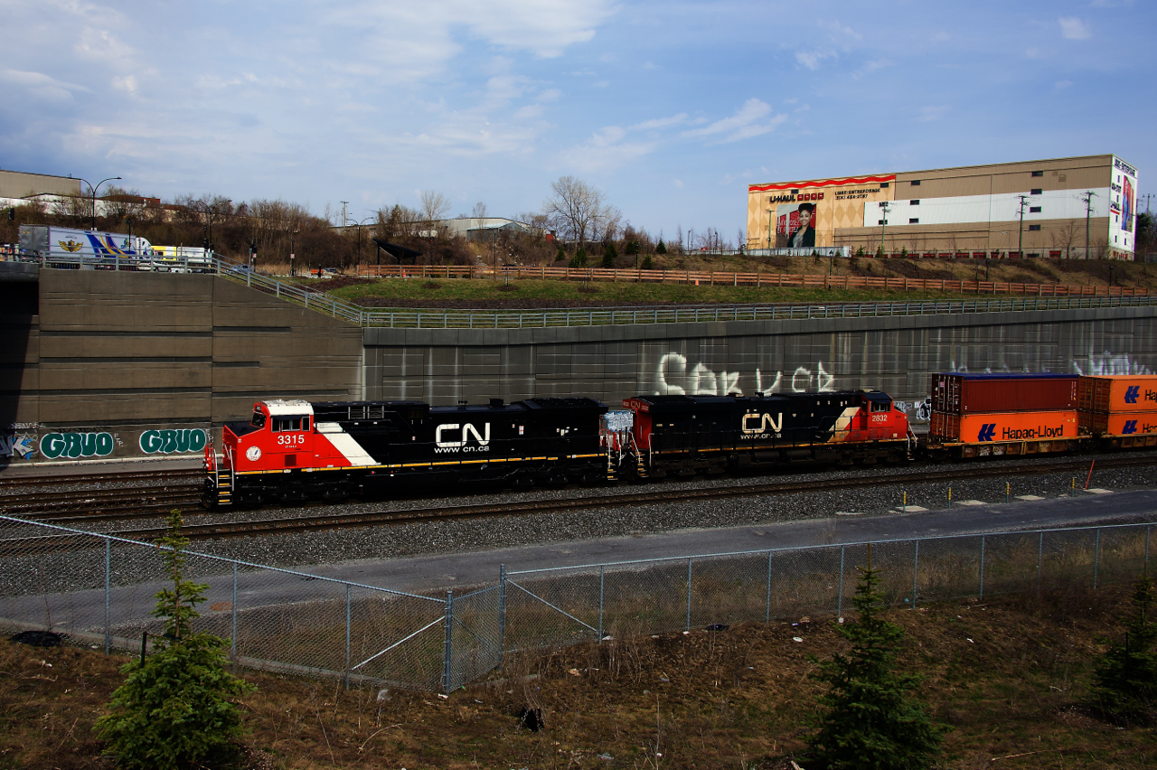 Caption: Freshly rebuilt CN 3315 leads CN X123 past Turcot Ouest.