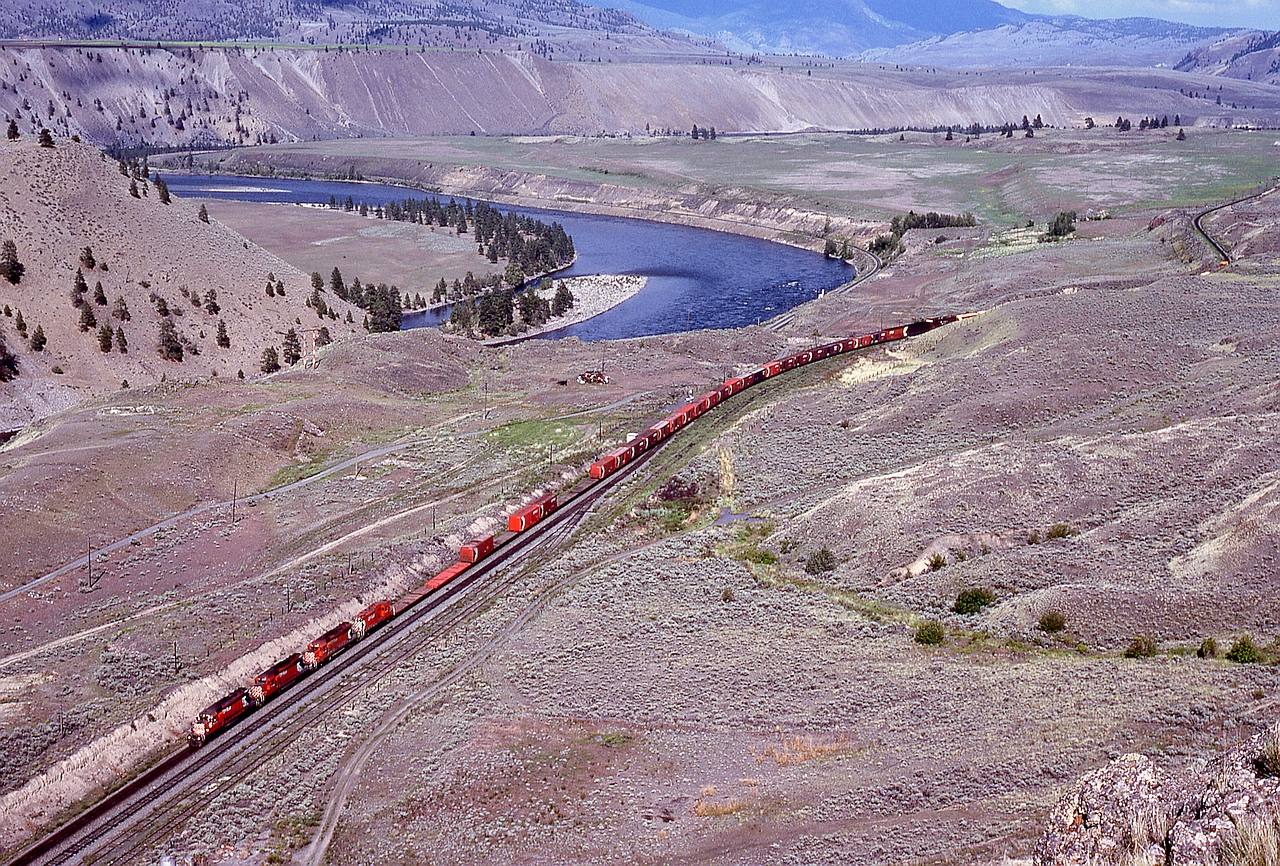 Caption: Alongside the Thompson River west from Savona, CP’s mainline climbs to Walhachin, and at the summit on the compass-south side is an outcrop of rock ideal for crushing into ballast, hence the two extra tracks beside the siding. From the top of that rock, the view eastward on Sunday 1980-06-08 at 1635 PDT included a CP westbound, symbol train 67, with 5664 + 5785 + 57xx + 8501 for power, and in the distance down close to the river, CN’s Ashcroft sub. mainline.