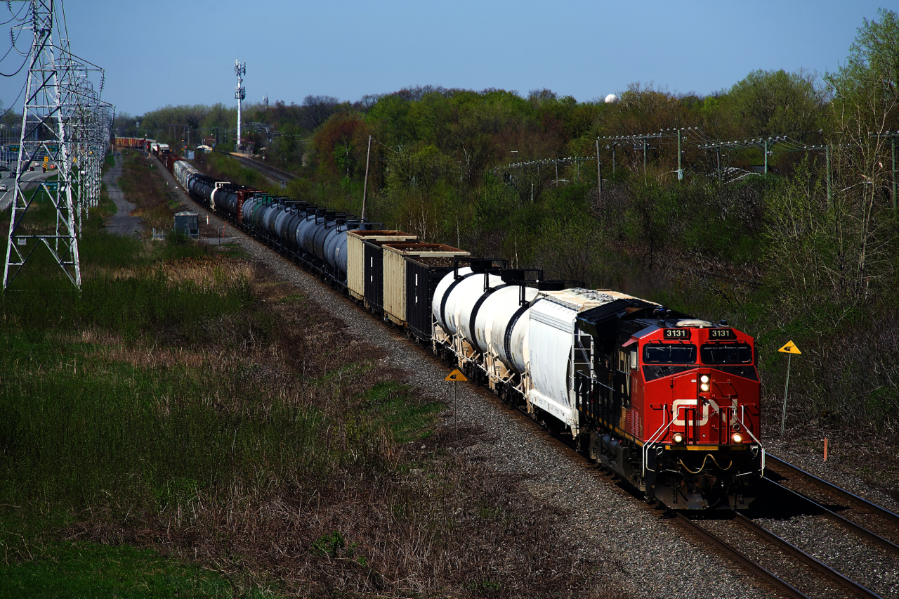CN 368 has 149 cars as it heads east with ex-GECX 3131 up front and ex-CREX unit CN 3983 mid-train.