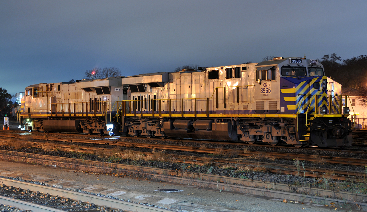 CN 3965 and CN 3945 are pictured tied down at Brantford after assisting a westbound up the hill earlier in the evening