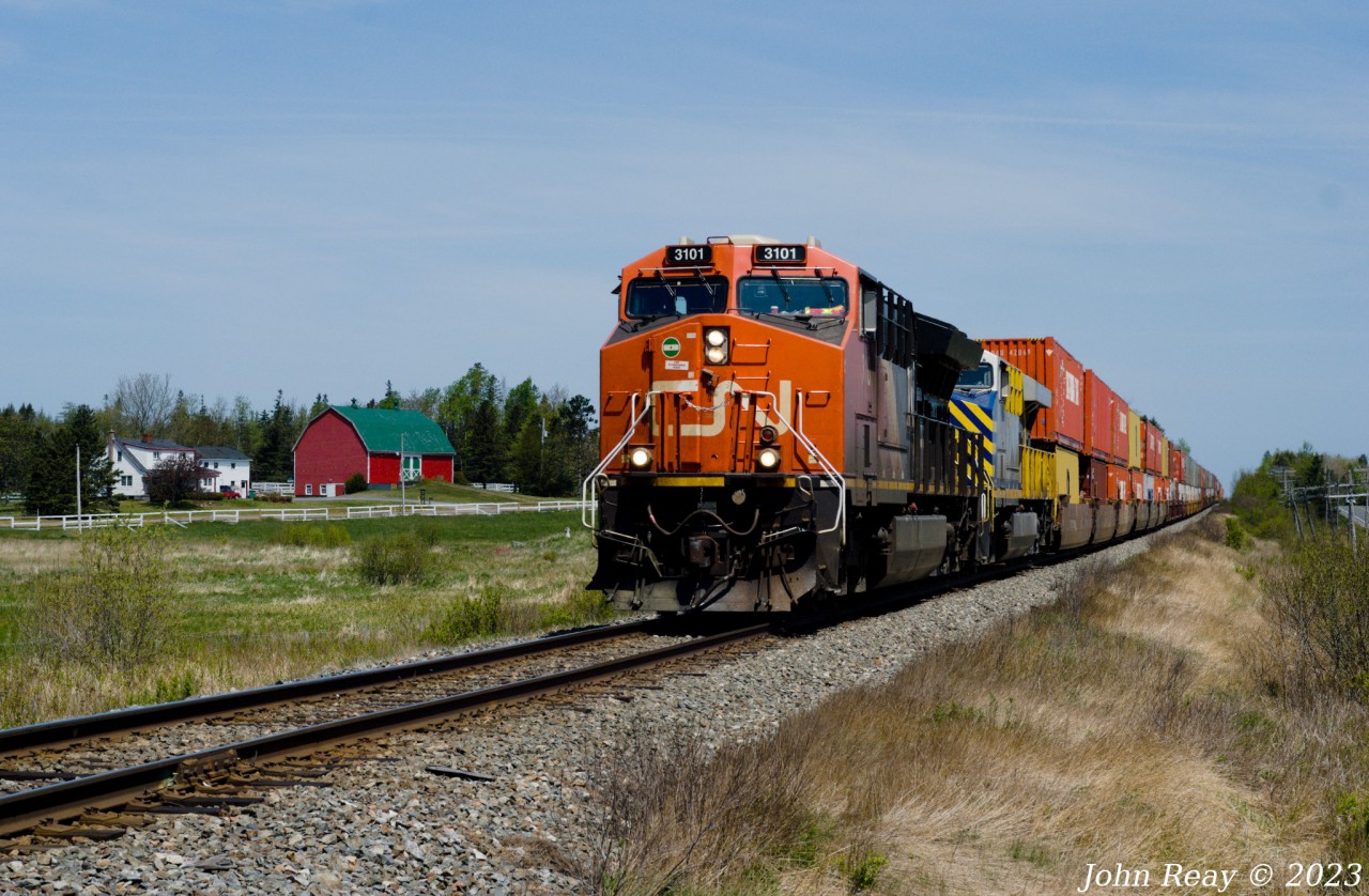 Caption: Seen here is the head-end of CN Z120 on May 31st 2023, at Brookfield NS on the Bedford sub with CN 3101 and CN (ex-CREX) 2761 and 534 axles (DPU CN 3020 is mid-train.) This was part of a day out with Halifax area railfan Geoff Doane where we chased this train from the New Brunswick border close to 140 km to south of Truro. In that distance we shot this train six times then had lunch in Truro and lucked into an encounter with CBNS train 305 arriving in the yard there. This was our final location for Z120, about 2 miles north of the Canada Cement spur.