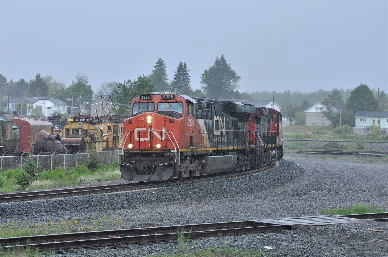 Caption: A tropical downpour is taking place as a CN freight pulls out of Capreol, Ontario on June 30, 2018. Power for the train is CN 2226 2515 and CEFX 6007