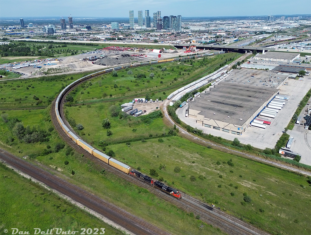 Caption: Pulling out of CN's MacMillan Yard on York 2, CN SD70M-2's 8811 and 8900 depart with train #306 eastbound taking the curve to enter the York Subdivison. The two tracks at the bottom are the Halton-York bypass tracks. Highway 407 ETR is the first overpass visible, and further back are the growing condos and highrises surrounding the Vaughan Metropolitan Centre subway station at Highway 7 and Jane Street. MacMillan Yard is off to the upper right out of frame.