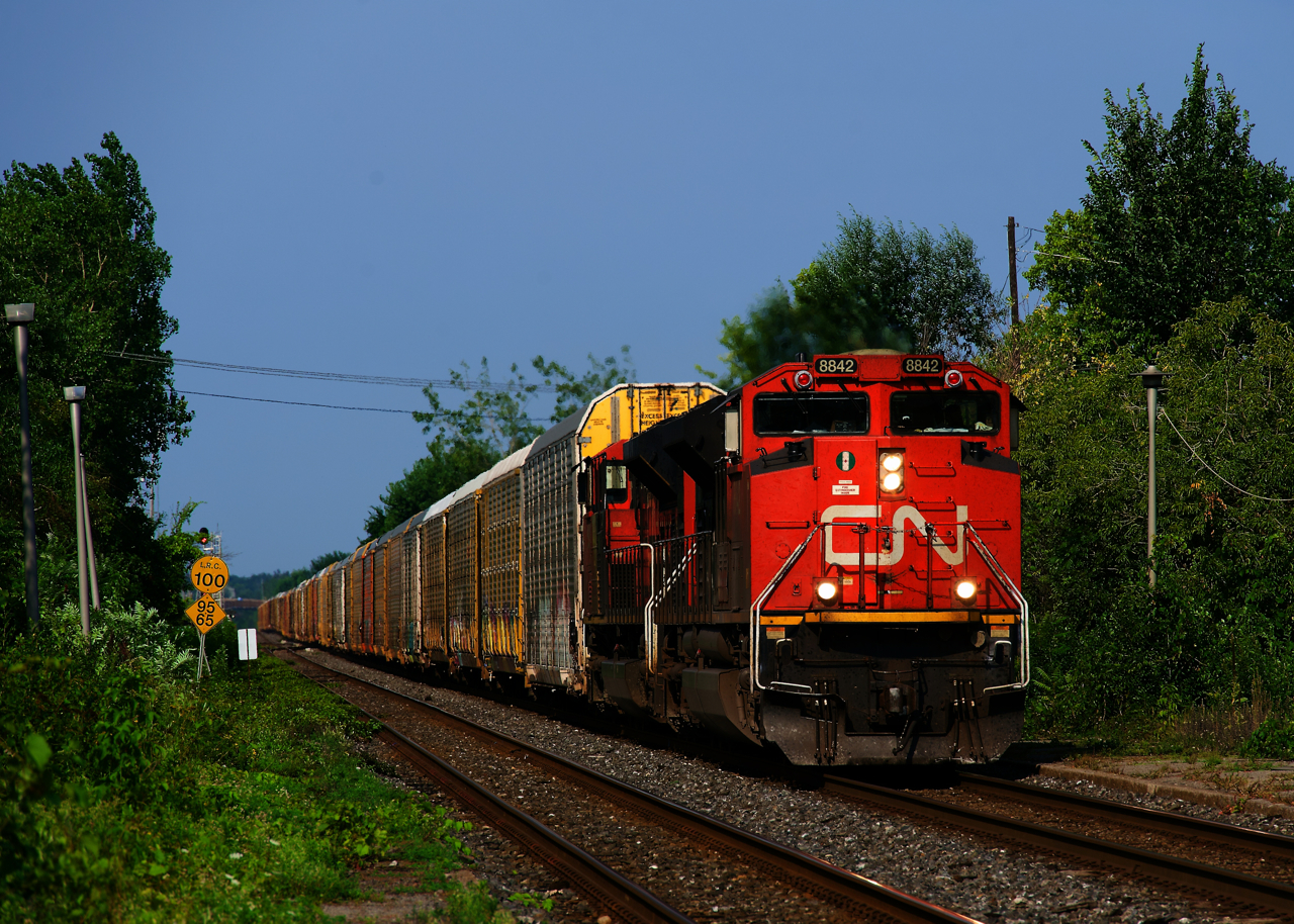 CN X276 has a 276-axle long train as it approaches Dorval Station with a pair of SD70M-2s (CN 8842 & CN 8917) for power and a consist of autoracks.