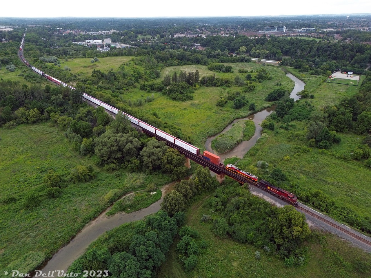 Caption: CPKC train #420 makes its way south down the MacTier Sub, crossing the mighty Humber River south of Woodbridge on the approach to Emery. Today's power is CP AC4400CW 9713 and KCSM SD70ACe 4163.