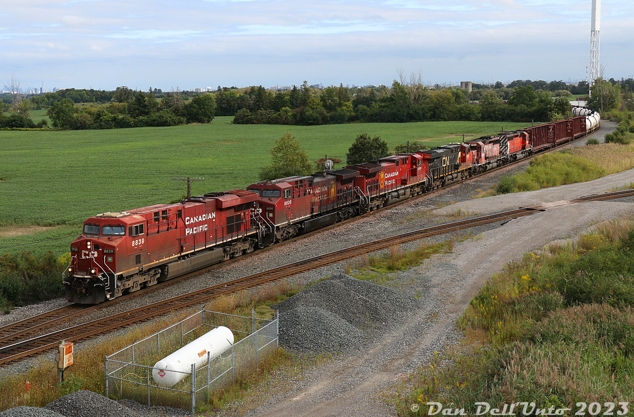 Caption: CPKC's "Friday Night Special" #421 heads north up the MacTier Sub at Elder with a long train lead, by a nice mix of power up front: CP ES44AC 8839, oily AC4400CW 9830, clean AC4400CWM 8200, borrowed CN ES44AC 2923, and old SD40-2's 6028 (in ratty faded pink System paint) and 6055 (multimark!). If one looks carefully, they can see the ever-present CN Tower from here.