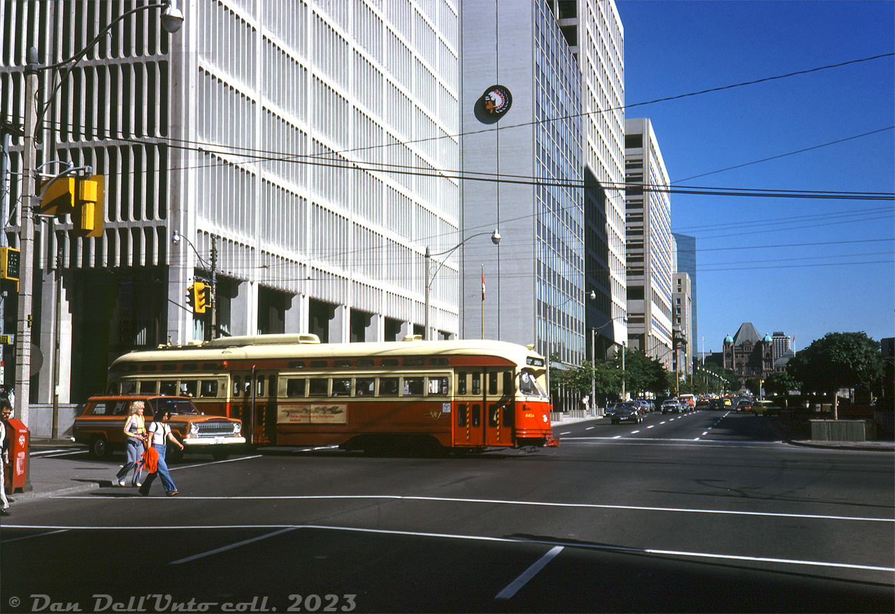 Caption: TTC PCC 4404 (A7-class, blt CC&F 1949) operates on the Dundas route as it crosses University Avenue eastbound on Dundas Street as southbound traffic approaches. An orange Jeep Wagoneer waits on pedestrians crossing with the light. In the distance is Queen's Park, home of the Ontario legislature.