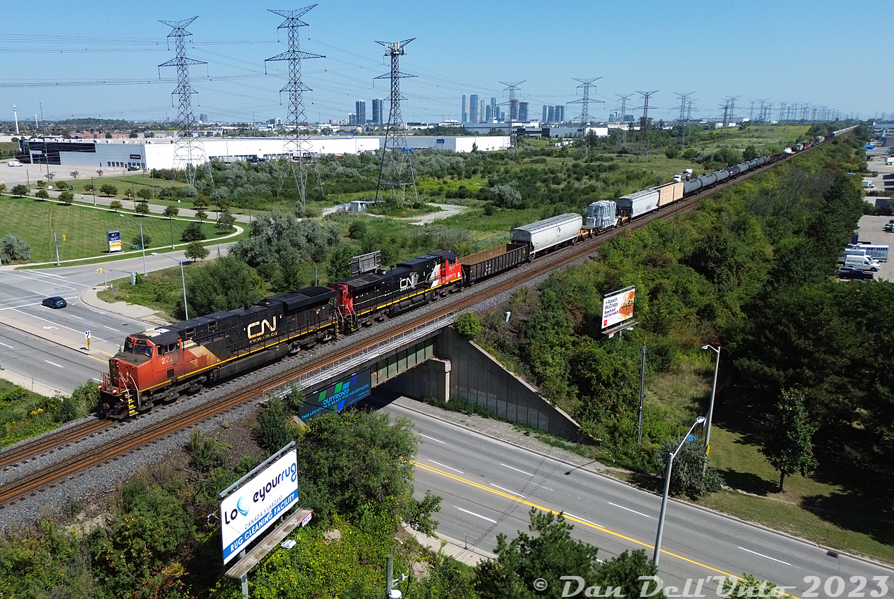 The 21st century solution? Put a drone in the sky, here capturing CN #435 with ES44DC 2224 and C44-9WL 2517 crossing over Pine Valley Drive on the approach to the Humber River bridge, not long after departing nearby MacMillan Yard. A dimensional transformer load rides a heavy-duty 8-axle TTX flatcar near the head end. New LED advertising signs have recently been installed on the bridge, original to the line, but the old CN noodle logo and classic green colour CN used on so many bridge structures remains.