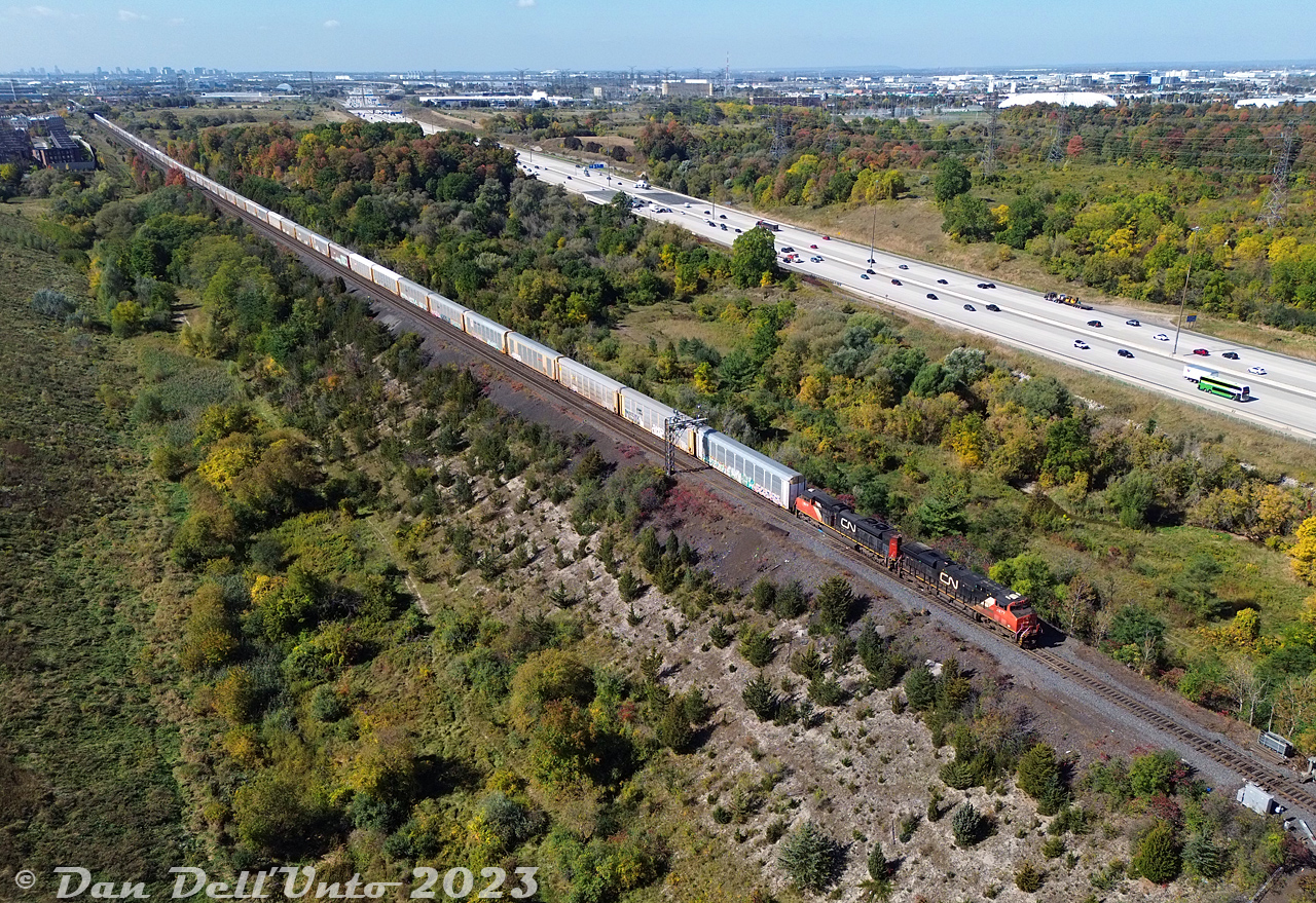Caption: CN ES44AC 2877 and SD70M-2 8007 (with wonky cab numbers) race a GO bus on the adjacent Highway 407 as they roll train #276 eastbound downgrade through the equilateral turnouts at the west end of the Humber, about to cross the single-tracked Humber River bridge at Mile 4.3 of the Halton Subdivision.