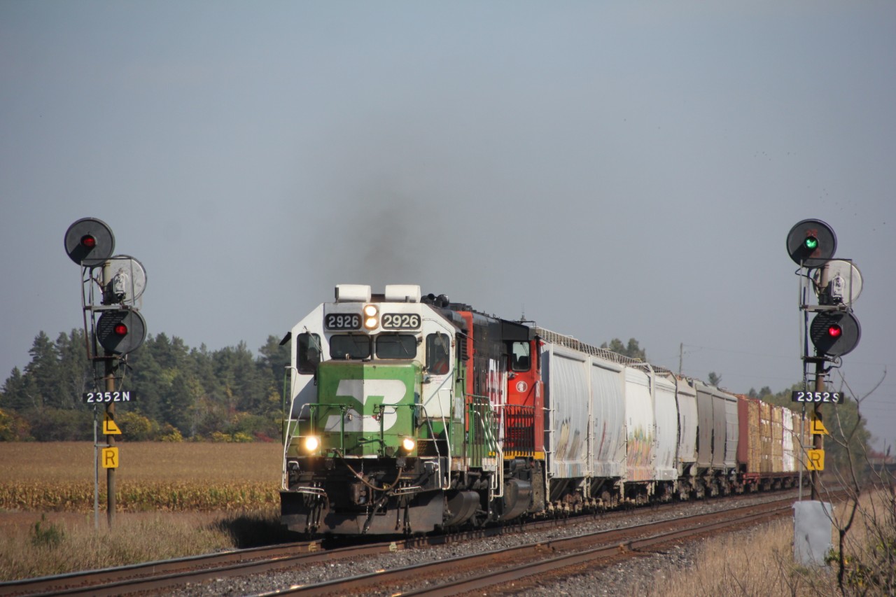 Caption: BNSF 2926 GP39E still retains its white face BN paint along with its as built GP35 look, Exterior only changes are middle cooling fan removed and air conditioning on cab roof added. CN local 518 splitting the signals at Tate Road Trenton heading to Cobourg. The hoppers are loaded just out of the Tri county mill in Trenton.2926 has to be one of the longest assigned units to Belleville. Arrived early May and still there as of October 17th. The second unit assigned to 518 has been changed out three times since,