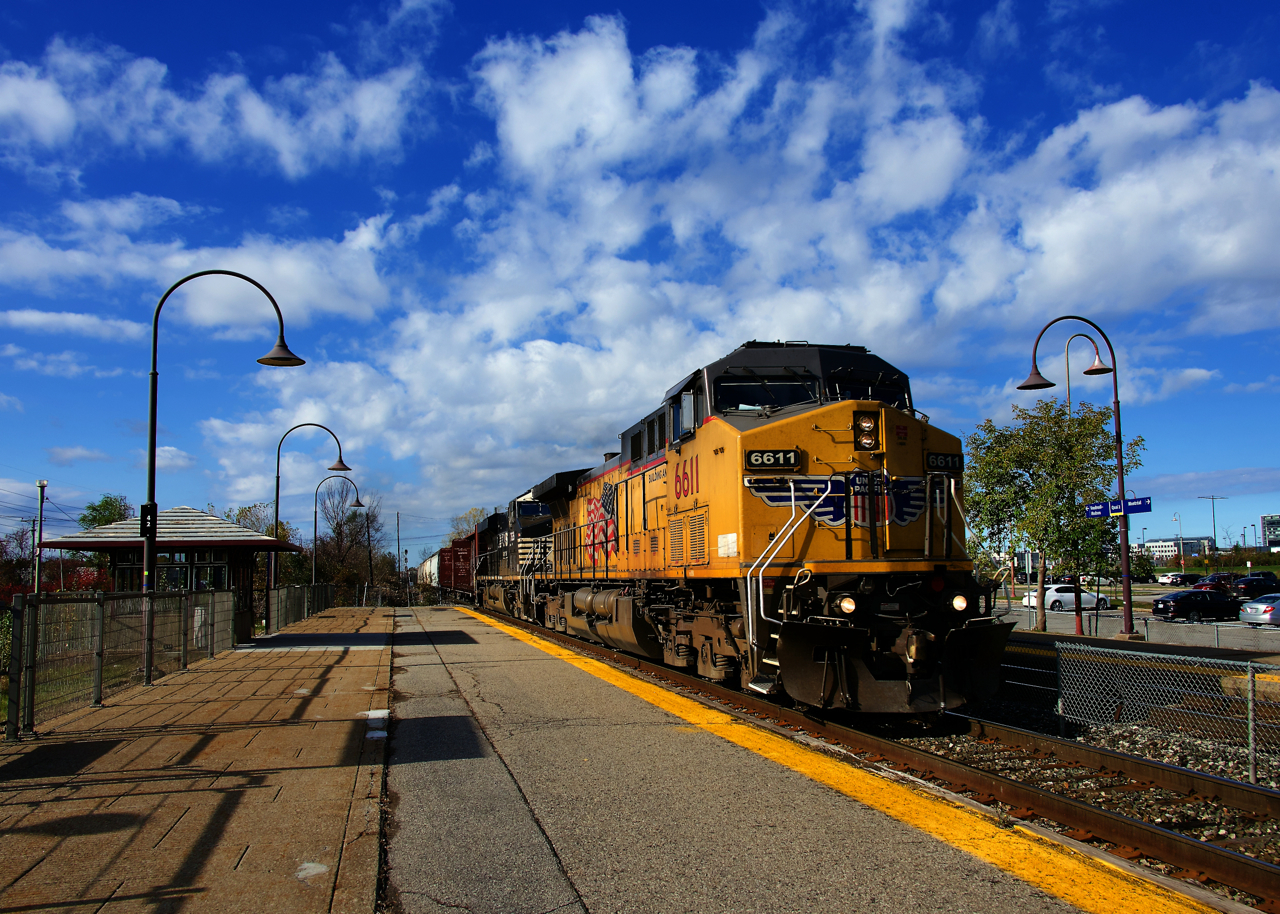 An extra rolls through Dorval Station with UP & NS power (UP 6611 & NS 7635).