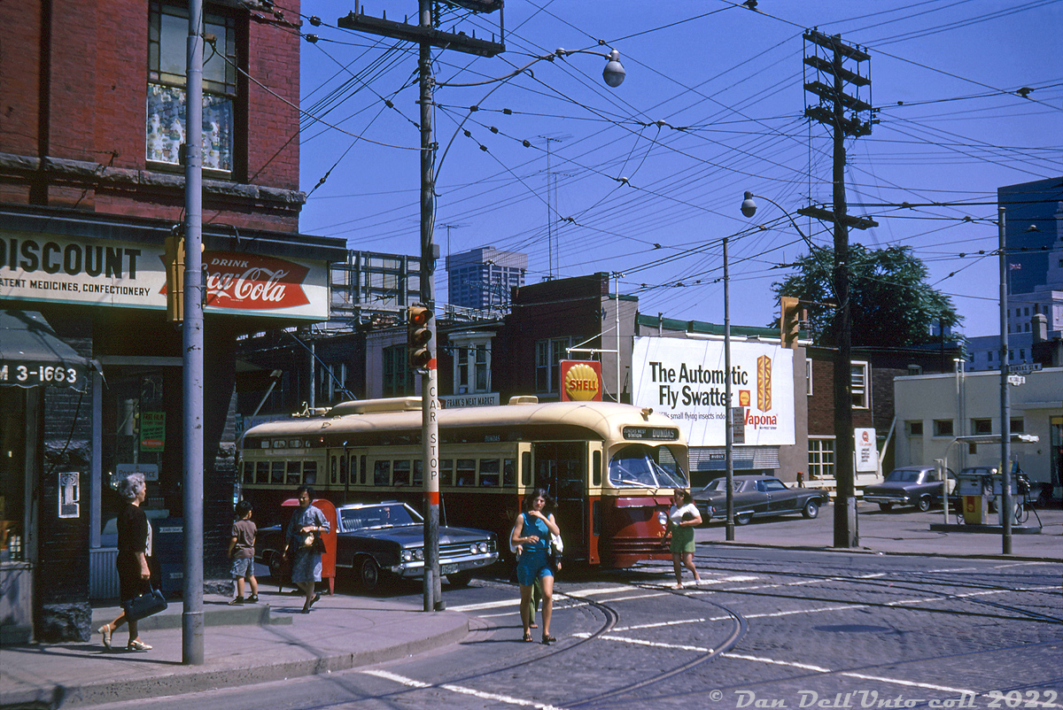 Caption: 70's street scenes: a TTC PCC streetcar (that appears to be 4353) is stopped at the lights as passengers get on and off, as viewed from the adjacent street corner. Pedestrians cross the street in front, and a mother and child wait to head into the corner confectionary store (Drink Coca-Cola!). On the other side of the street, cars wait to fuel up at the nearby Shell gas station. High rise buildings along the busy University Avenue thoroughfare can be seen poking up in the distance amid all the aerial TV antennas in the sky, including the new Simpsons Tower at Bay and Queen.