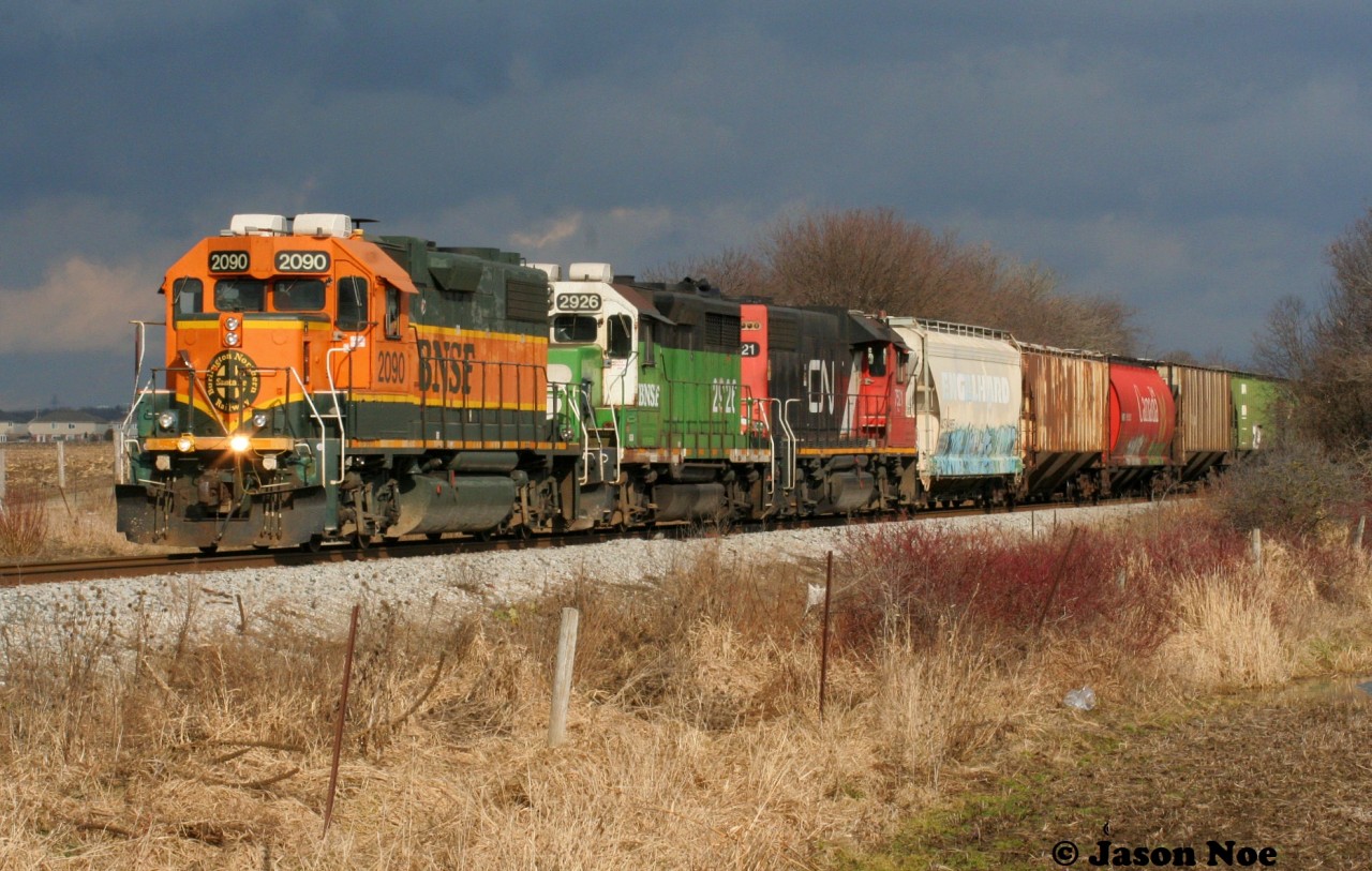 Here, CN L568 with BNSF GP38-2 2090, BNSF GP38-2 2926 and CN GP38-2 7521 is seen at Nafziger Road, just west of Baden, Ontario after switching industries around New Hamburg. The train would then proceed west to Stratford, Ontario over the Guelph Subdivision.