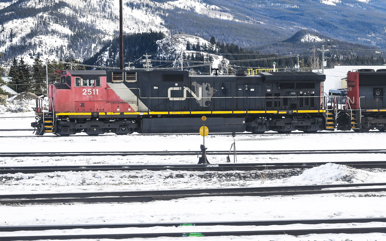 CN 2511 still wearing its faded CN North America paint and stencil idles away in the yard at Jasper, AB Mile 0.0 Albreda Sub. on January 27, 2024.