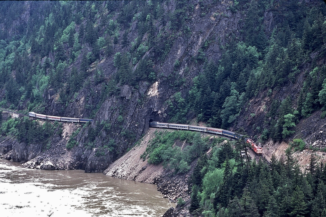 Near Spuzzum (?), the view from the Trans Canada Highway, VIA #2 on CP Rail, May 14, 1980 Kodachrome by S.Danko