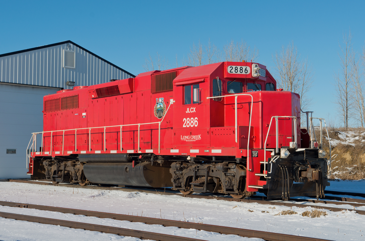 Caption: JLCX 2886 has been a long term resident on the Long Creek Railroad and in this photo, is spotted nicely outside the shop building. This unit has a VERY interesting history. It was built for the original Norfolk Southern (NSRR) in 7/67 with a low short hood, no DB, was short hood forward, and had a much smaller fuel tank. It went on to be acquired by the SOU and was rebuilt with a high short hood, was set up long hood forward, and was given an extended fuel tank. It went on to wear NS paint and was eventually sold to the Chattahoochee & Gulf RR where it received a low short hood (again). It seemingly wasn't till the unit was acquired by JLCX that it received dynamic brakes! At 56+ years old, 2886 is still toughing out winters in southern Saskatchewan.