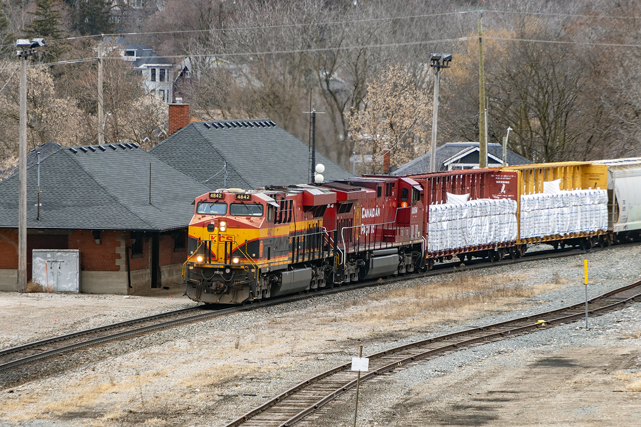 Caption: Wow.....having just lost the 2 ACU's that were assigned to 238-239 for a month CP's power control geniuses....for they can be nothing but, have very kindly assigned KCS 4842 and CP 8054 to the job for the last two trips. I have no idea how long this will last, but I'll take every opportunity I can get. 238 passes Galt Station; in dire need of a Huntsville style train order signal.