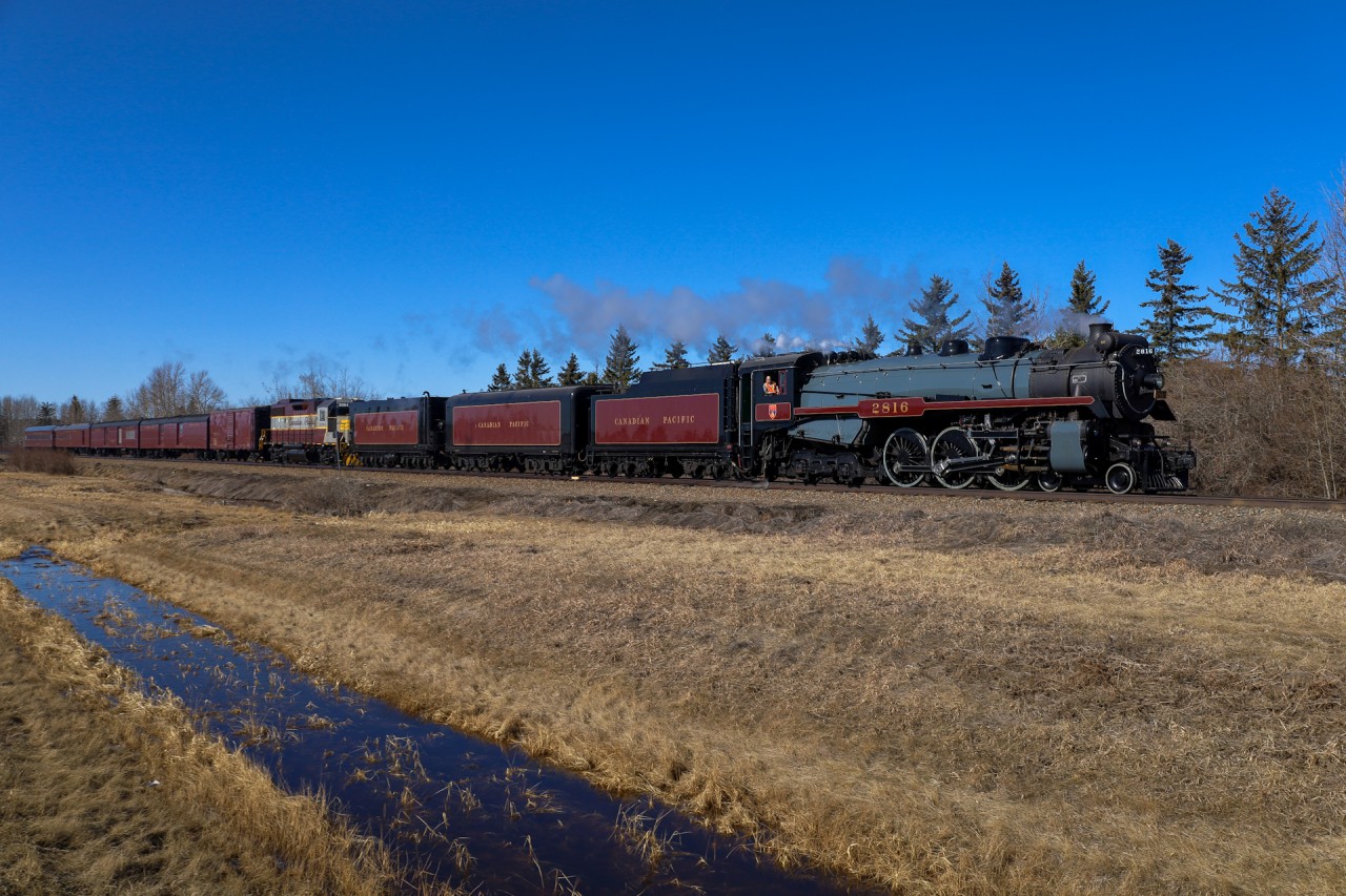 Caption: In just under a month, the 2816 will embark on her three country tour and will likely become the most photographed locomotive in North America. But on this quiet March afternoon, it’s just the Empress and me, as she steams north towards Edmonton.