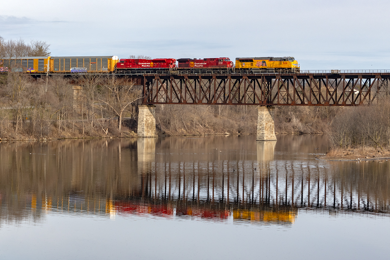 Continuing the trend of spectacular unique leaders, witness UP 3030 along with 8100 and 7046 shattering the calm crossing the Grand River in Cambridge under the watchful eyes of numerous Canada Geese.