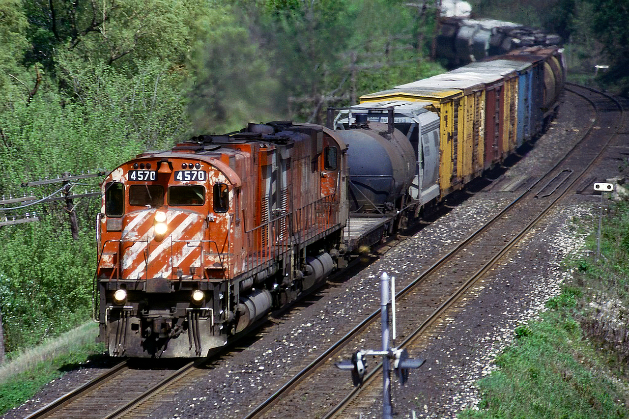 Caption: I don't have a whole lot of pictures of the big M's running out their last miles. But while sitting in Milton next to the CN bridge over CP I was lucky enough to have this sight for sore eyes come around the corner. I'm, am still of the opinion that 1990-1997 was the greatest time for railroading in North America. The power was almost always all at the front, trains were plentiful, DPU's didn't exist, someone around the tracks wasn't viewed as a national security threat, release forms got you free tours of the yard, but mostly, that anything might be leading coming around the corner.