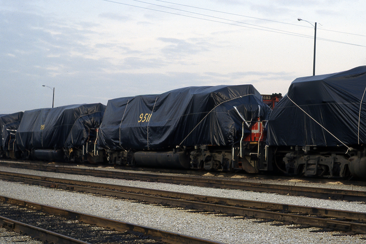 Caption: Welcome to CN. "Why the hell would they start a course when people are still laid off" I overhead in the A building at Mac Yard as I began what to be my life's dream job. 3 weeks of classroom writing out the rule book(to appease the lawyers, no doubt), with tours of the yard, fam trips, and so much more. Questions of why 40-50 GP40-2's sat wrapped like this in L yard during the lingering downturn would lead to an 18-month layoff halfway through my 25 training trips where I was an extra body on a yard crew learning more than could ever be taught in a classroom. More layoffs, a brief stint and Bridges and Structures before being loaned to the Western Divison; just as their traffic collapsed, before being recalled in Ontario in November of 1984......and working 56 straight days in a row when it happened. Such is how quickly traffic can pick up on the railroad.