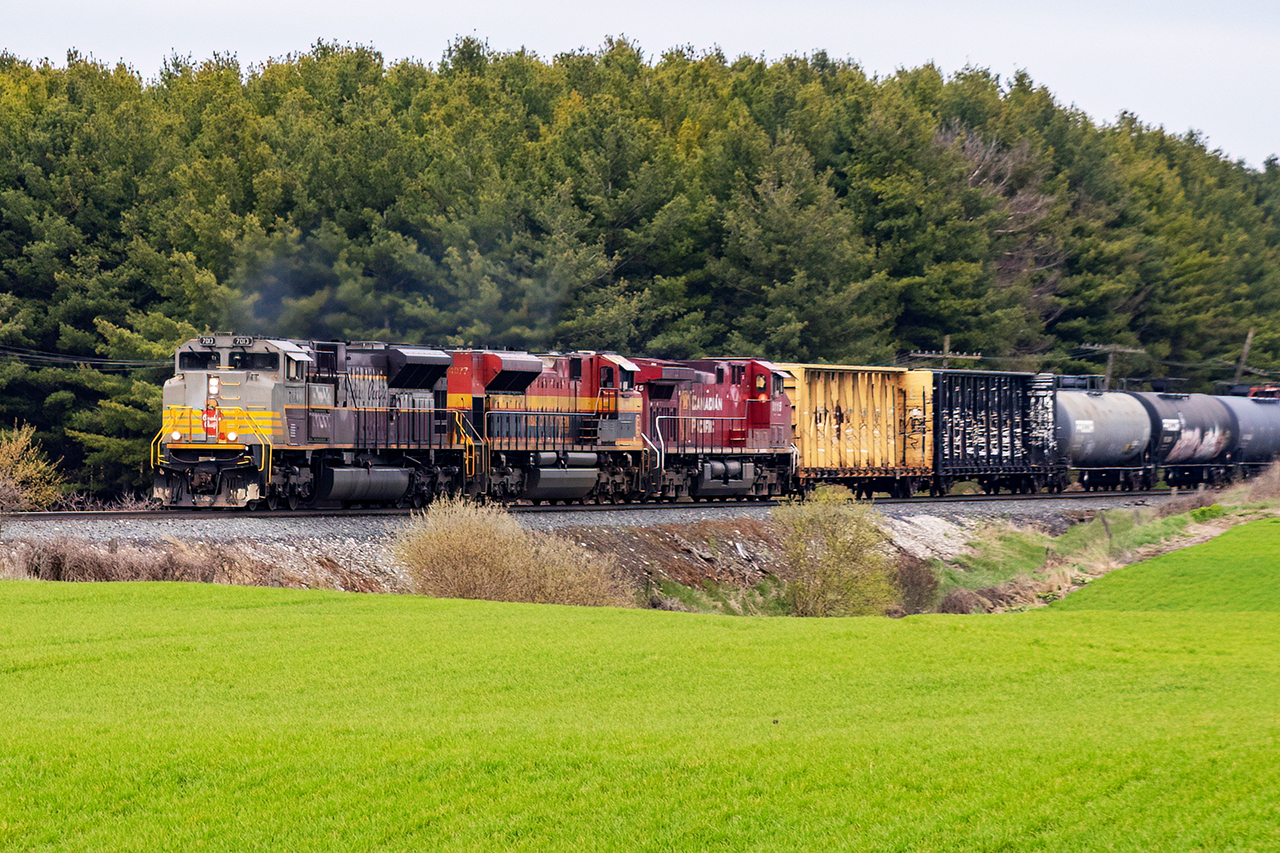 Caption: There are only 9 of these units left now, with 7015's future still to be determined (It went dead to Chicago on 137 yesterday. Where it goes from there will speak loudly about its future). Trailed by KCSM 4077 ( a trailing KCS unit becoming ubiquitous on CP these days;' who saw that coming)and 8112, 137 flies through Drumbo with a cut of mixed freight just lifted in Wolverton. CP was just going Action Red when I started paying attention to trains, so I never got to see this scheme in real life on anything, much less the C630s and SD40s where it looked perfect. But I'll take as much of this as I can get; a scheme that harkens back to when railroading was still great, and service mattered just as much as shareholders; something a few CEOs need to contemplate IMHO.