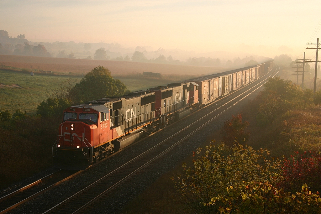 Caption: CN 5783 emerges from the early morning mist at Newtonville
