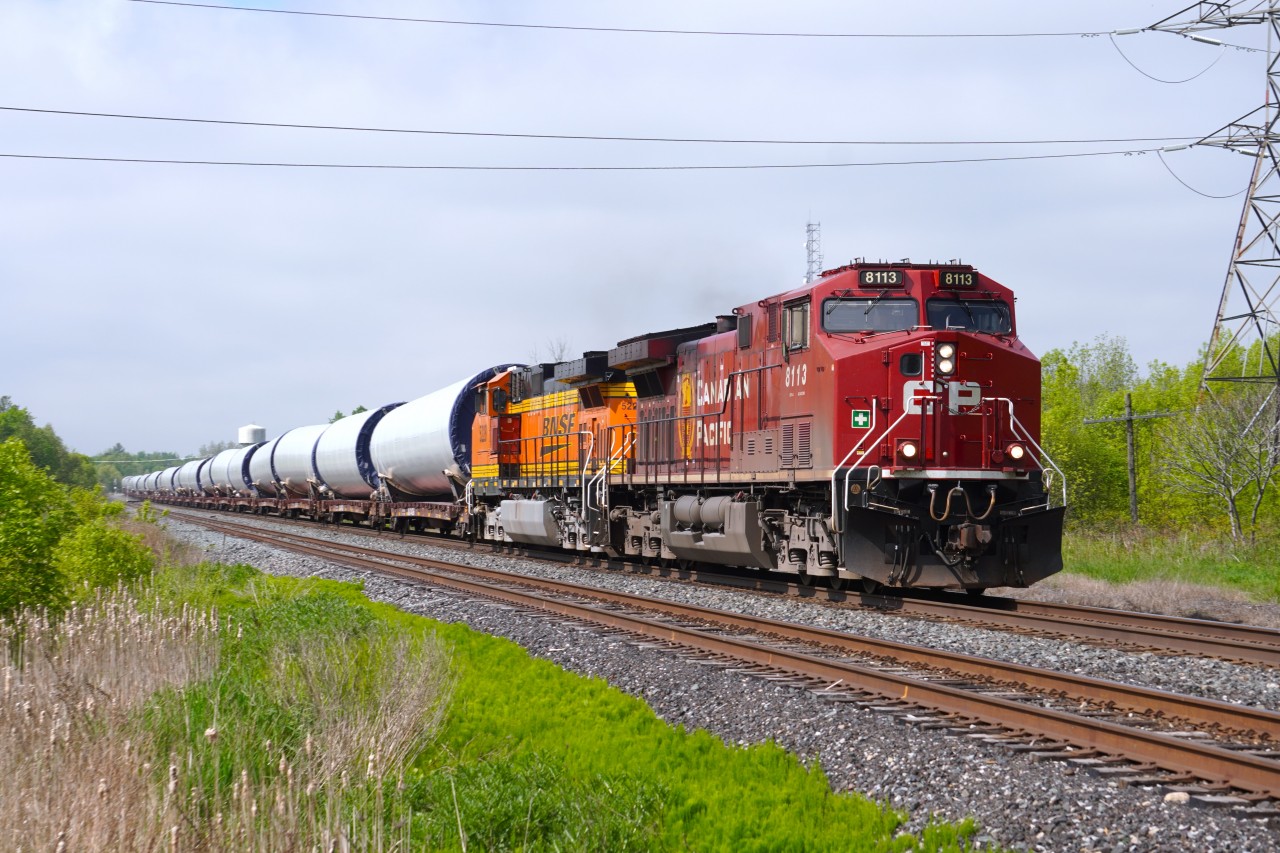 Caption: After coming into Agincourt Yard off the Mactier Sub earlier this morning, loaded windmill parts train DIM-08 from Colorado continues through Cherrywood on its way Eastwards to Maine with CP 8113 leading and a repainted Dash-9 BNSF 5228 trailing.