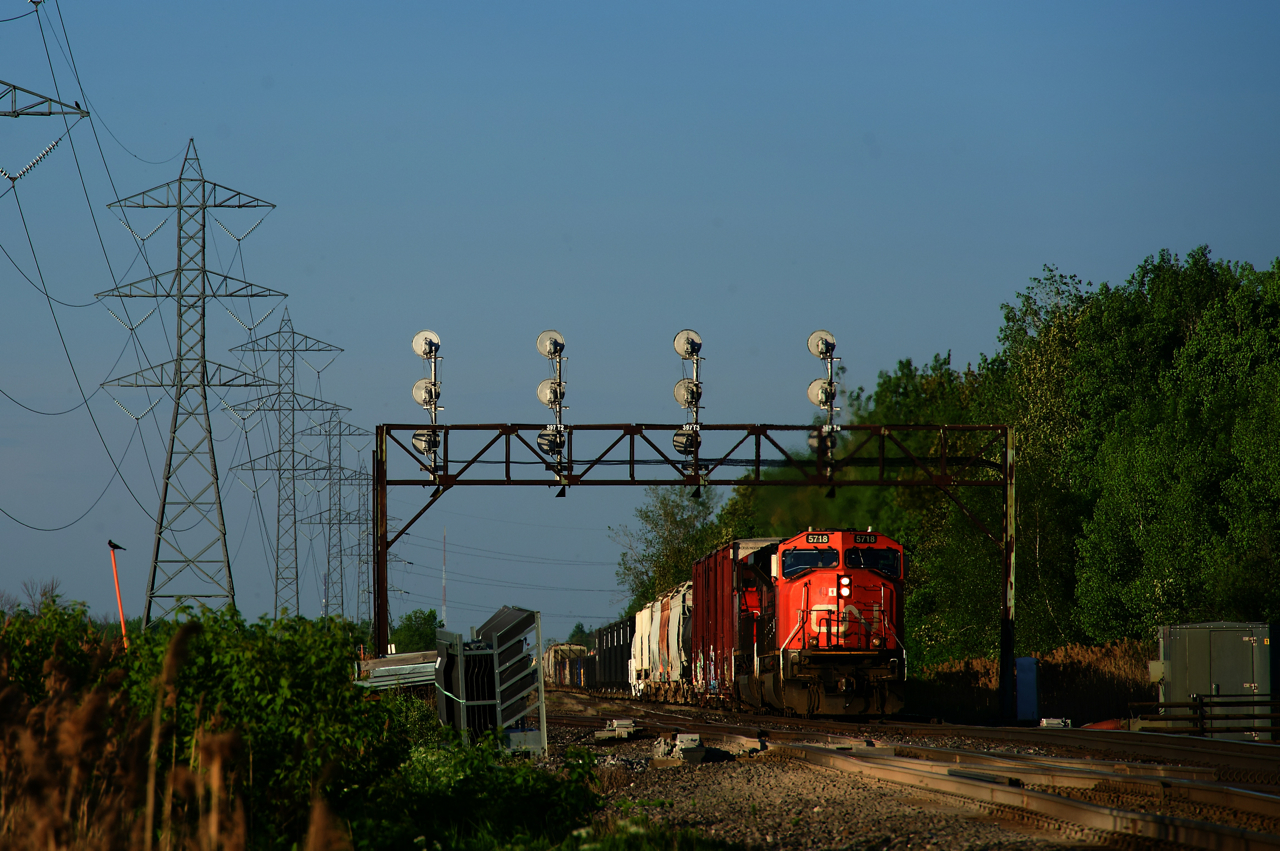 CN 321 is passing under a vintage signal bridge as it prepares to do a tail end lift at Coteau. Work has already begun on replacing the various signals around Coteau, including this one.