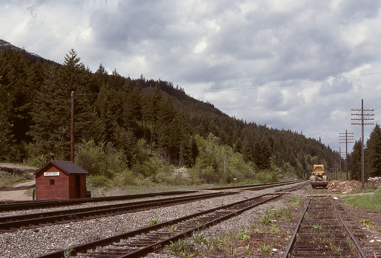 When on track patrols there in 2007, the history of Keefers was “felt” all about, and just east of the east end of the siding, a chilling reminder of more recent history was the view across the river to a scar on the bank below CN’s Ashcroft sub. where a washout, derailment, and fire 1997-03-26 at Conrad ended the lives of conductor Donald Fink and engineman Terry Gallis on eastward freight train Q-102-51-26 powered by CN 5658 + 9546.