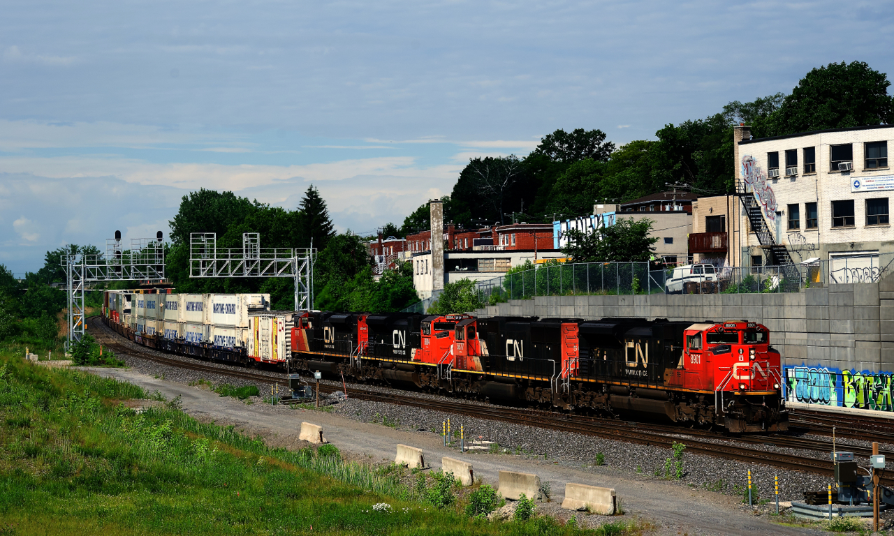 CN 120 unusually has four EMDs up front (as well as a test boxcar) as it approaches Turcot Ouest.