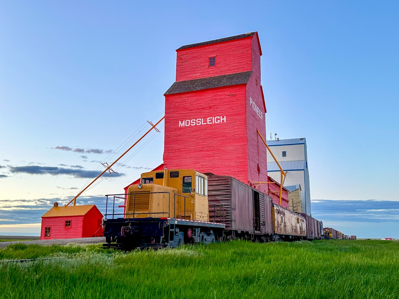 Caption: The repainted Mossleigh Elevator looms over the storage track at Aspen Crossing.