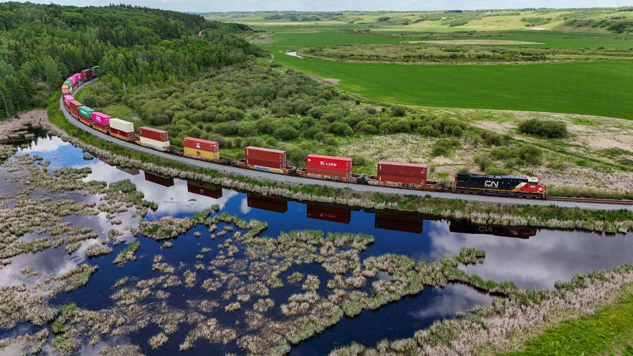 Caption: X 14451 17 climbs out of the Battle River Valley, at Ferlow Junction where the Stettler Sub, connected with the Camrose Sub. If you look closely at the bottom right frame, you can see part of the old right of way.