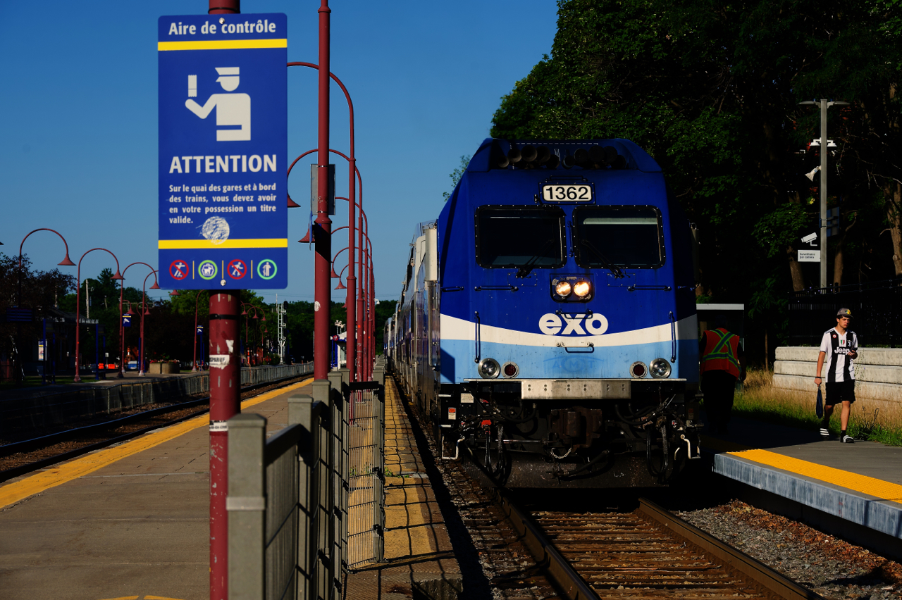 Caption: EXO 174 is stopped at Montreal West Station, the temporary terminus for this train from Saint-Jérôme. With Lucien L'Allier Station closed due to reconstruction work, all Saint-Jérôme trains are terminating at Parc or Montreal West Station.