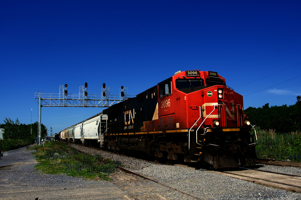 Caption: CN 368 is passing a quiet crossing near MP 28 of the Kingston Sub.