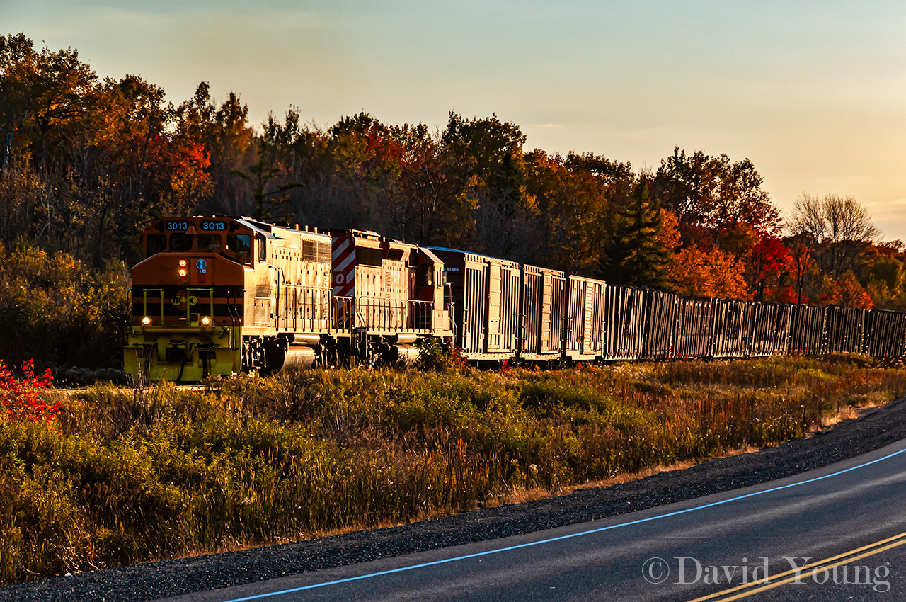 Caption: A chance encounter along Highway 17 with the eastbound Huron Central freight. HCRY GP40-2W 3013 and leased CP SD40-2 6030 trundle 34 car train of forest and steel goods along at sunset.