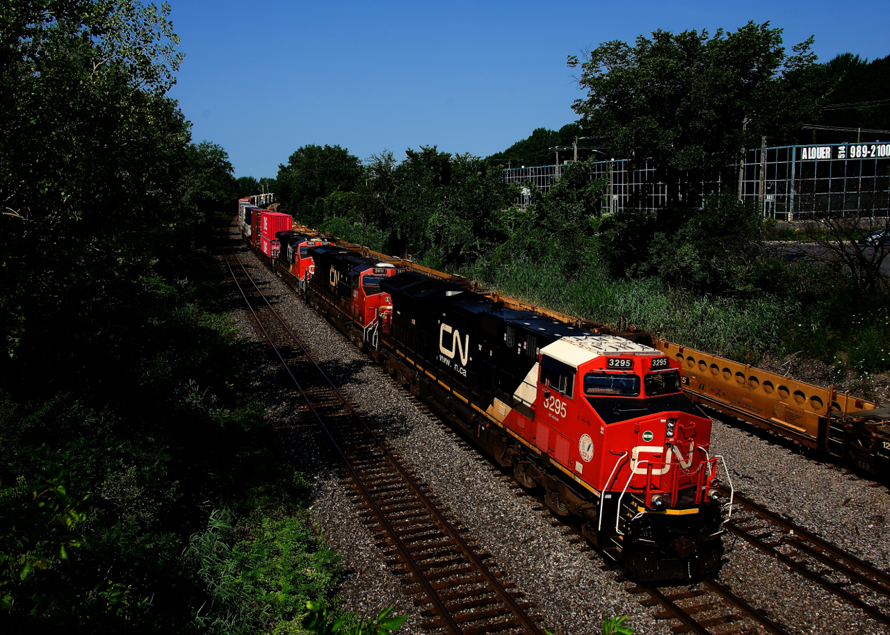 CN 120 has a trio of GEs up front as it passes well cars stored on the Transfer Track.
