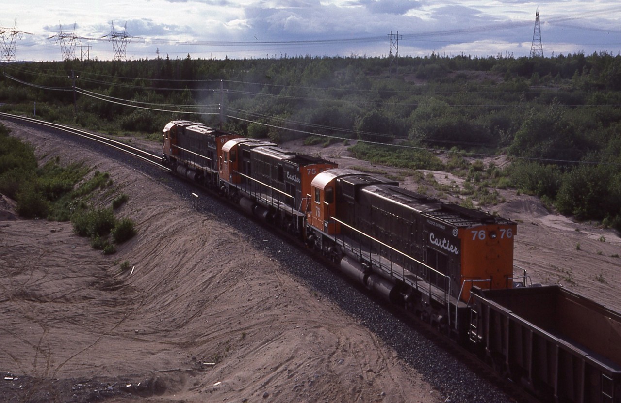 "Off into the Sunset".  I rather like this shot which was taken off the Hwy 138 bridge just north of town if I remember correctly.  Cartier 87, 75 and 76 are off into the north, destination Mont-Wright.