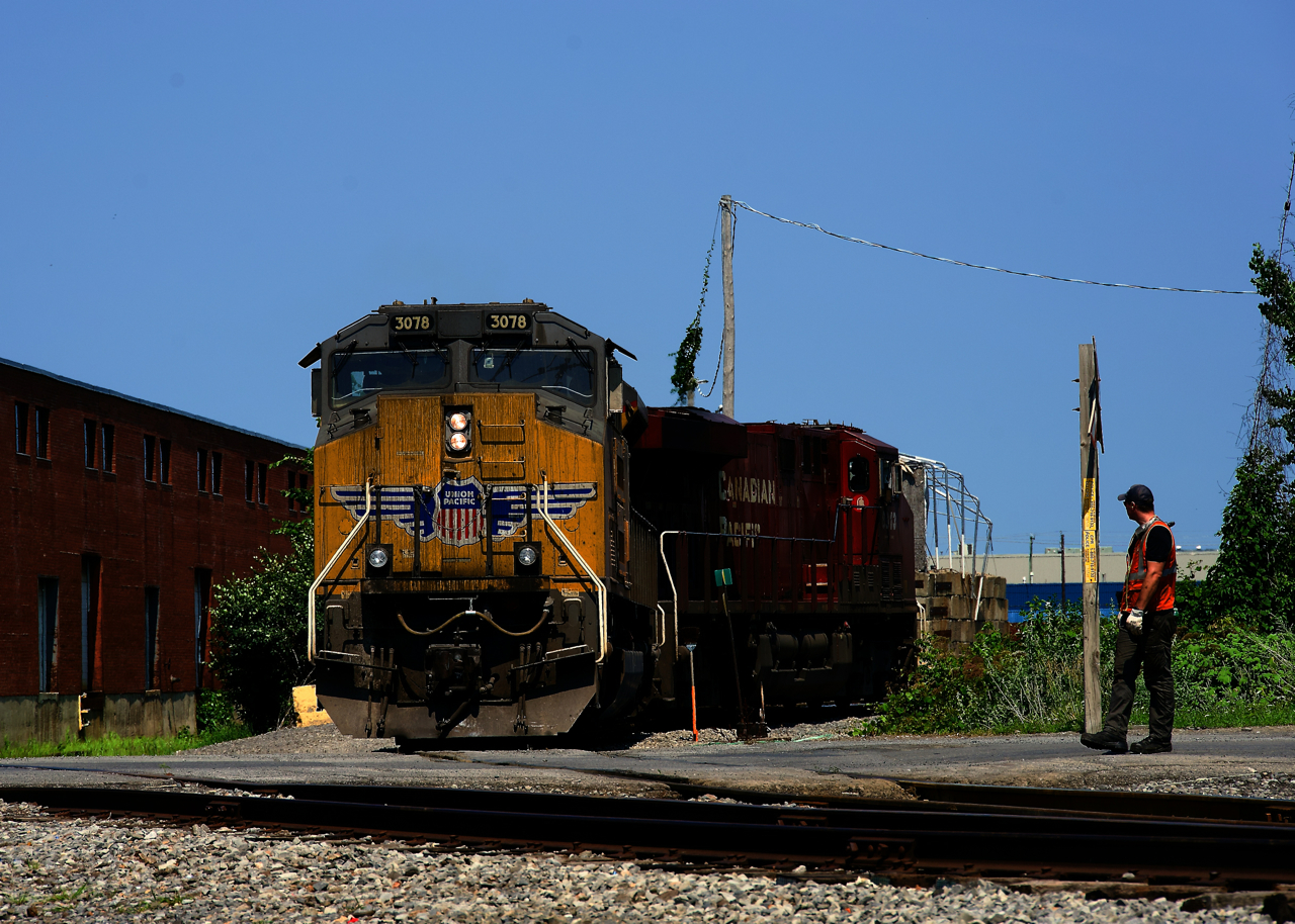 Caption: One of ten SD70ACe-T4 on lease to CPKC, UP 3078 is temporarily leading as it advances over a crossing just outside of Lachine IMS Yard. It is about to pick up rear DP CP 7025 before the power of CPKC 112 heads to St-Luc Yard.