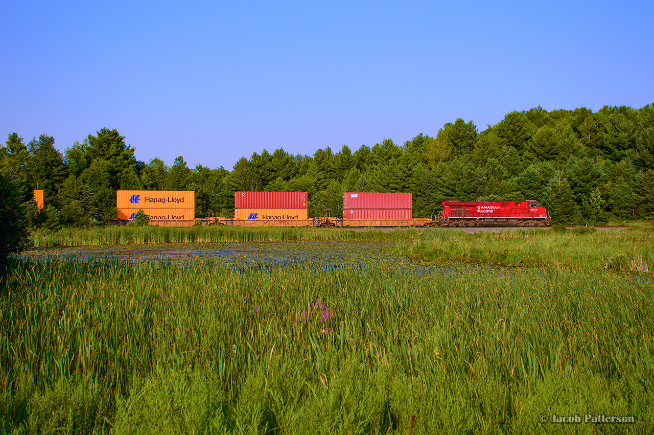CPKC 100 nears the end of its journey at Vaughn Intermodal Terminal, curving through the swamp at Palgrave.  CPKC 112 is running about 10 minutes behind, and will take it slow for the next while as 100 passes VIT, making a reverse move into the yard.