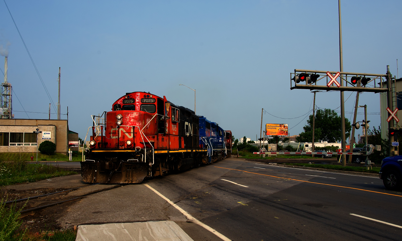 CN YRP002 has a beat up GP9 leading as it crosses Marien Avenue with 17 cars for a few clients.