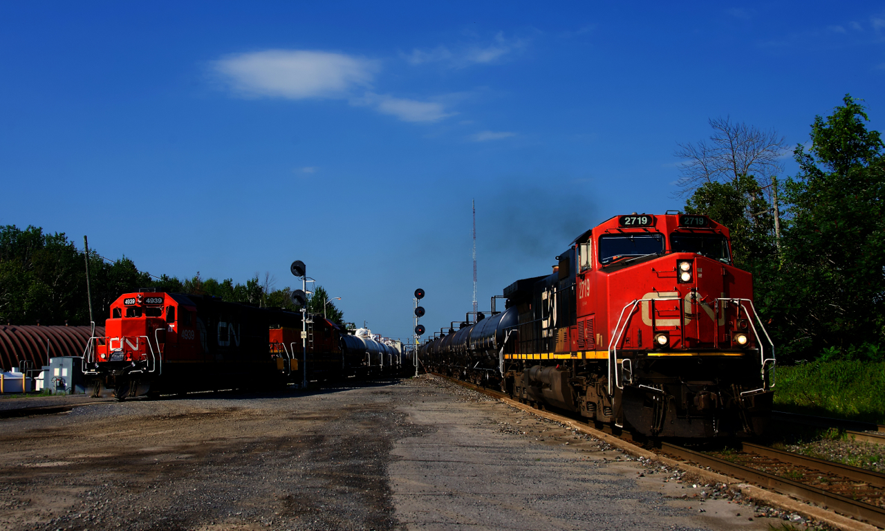 CN 538 is working the yard as CN 368 blasts by on the main line.