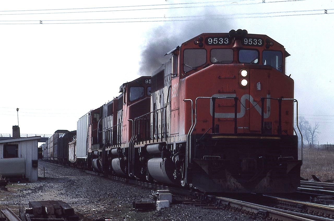 Caption: A trio of battle worn 9500s, lead by 9533, charge eastward out of MacMillan Yard Toronto, Ontario on a dull April afternoon.