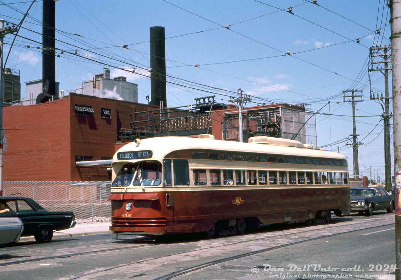 Caption: TTC PCC 4516 (A8-class, built by CC&F 1951) waits southbound on Weston Road waiting to make the left turn and head east on St. Clair Avenue. IT has just departed nearby Keele Loop, operating on a St. Clair run eastbound and then northbound on Mount Pleasant for Eglinton Loop. In the background is part of Swift's (later Bunge, demolished around 2009), one of the handful of packing houses that once populated this area of West Toronto.
