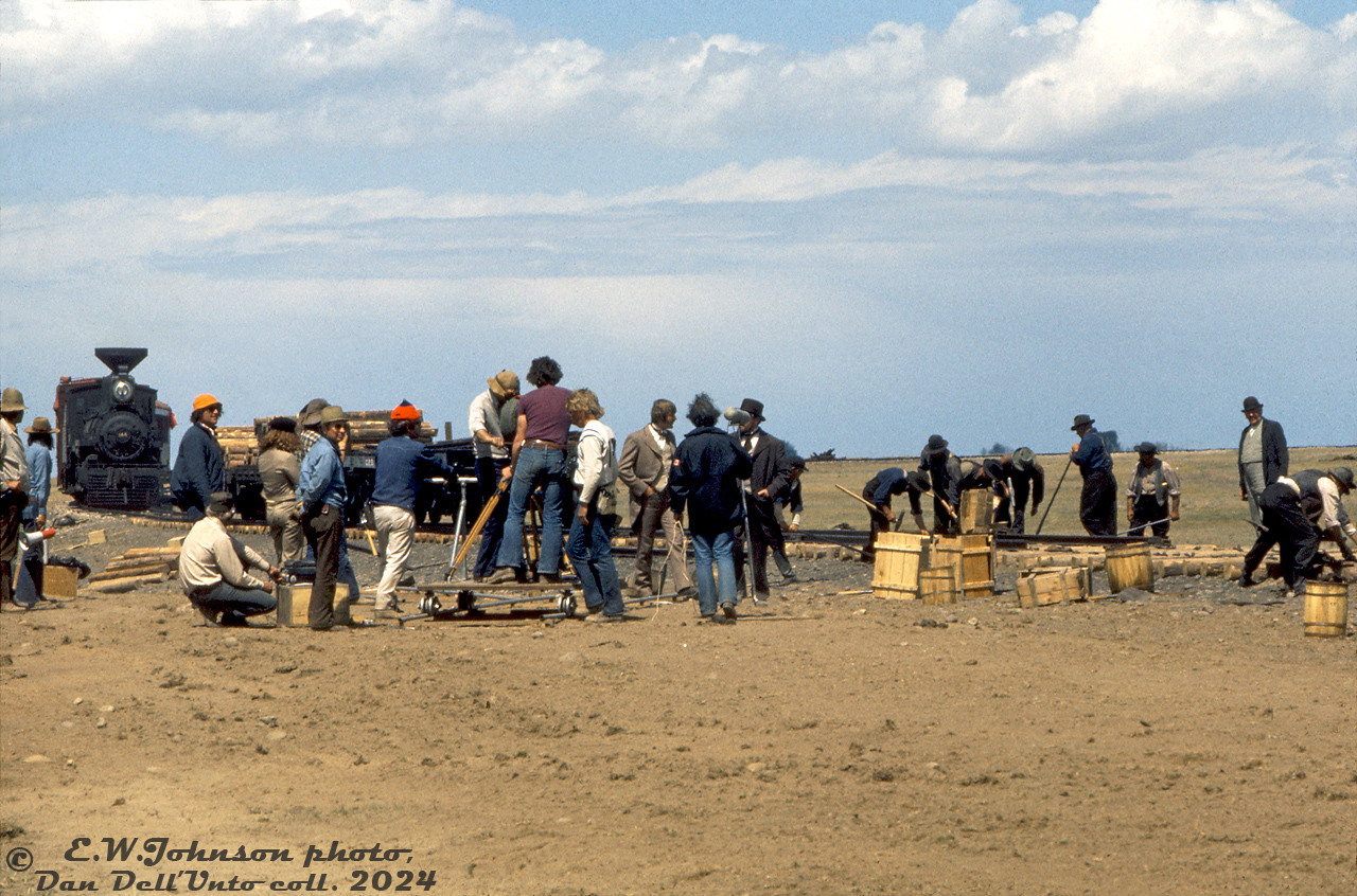 This is, of course, the dramatization: the filming of Pierre Berton's "The National Dream" - an eight-part series filmed by the CBC in 1973 and released in 1974 documenting the building of the Canadian Pacific Railway. Here, the filming crew are either rolling or setting up their shot with Van Horne (in black with hat, behind microphone) and Secretan (in grey). Workers toil away in the background laying and spiking down rails, while the supply train with 2-3 flatcars and Canadian Pacific "144" (really ORA's ex-CPR 4-4-0 136, borrowed for filming, backdated to 1880's appearance and given a different number) sits in the background. In this series, Van Horne was played by Canadian actor John Colicos, and Secretan by Davis Schurmann.