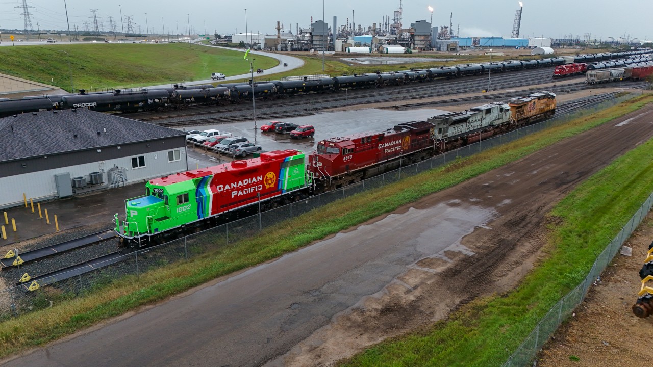 Caption: CP 1002, a unit converted to operate on Hydrogen sits on the Clover Bar shop track with CP 8013, CP 7022 and UP 7765.
