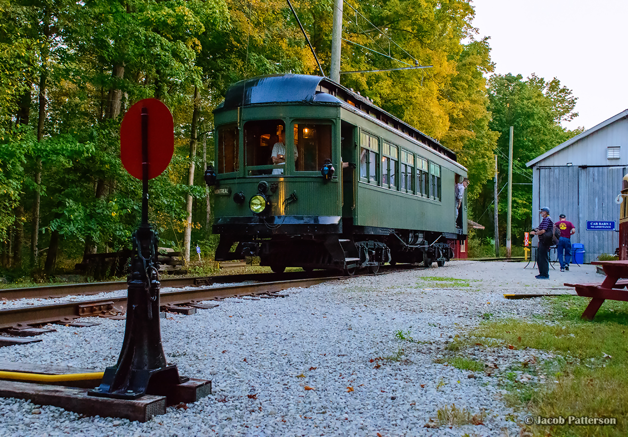 Caption: Montreal & Southern Counties Railway interurban car 107 is seen at the switch to the Halton County Radial Railway's east turning loop on one of its first runs in a number of years. This evening was an event for their membership (and invited photographers) in celebration of the museum's 70th anniversary, having been founded in January 1954. Car 107 was the museum's third acquisition, and their first interurban car. Built by the Ottawa Car Company in 1912, it saw service until 1955, and was acquired by the museum in 1956.