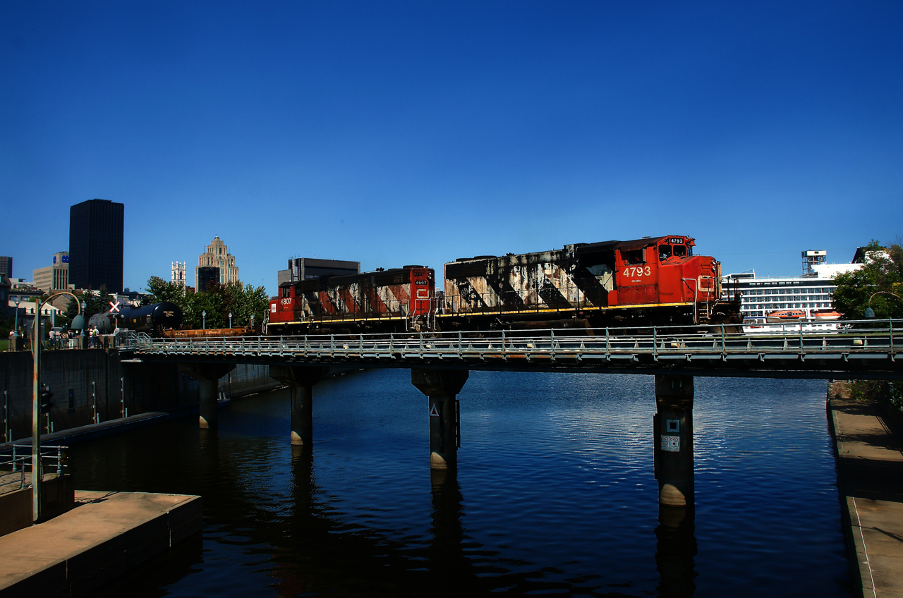 Caption: CN 500 is leaving the Port of Montreal, with a cruise ship docked in the background.