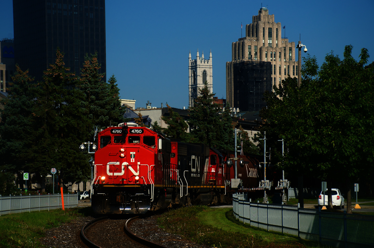 Caption: Repainted CN 4760 leads CN 500 out of the Port of Montreal. It will head to Track 29 to drop off 3,800 feet of traffic.